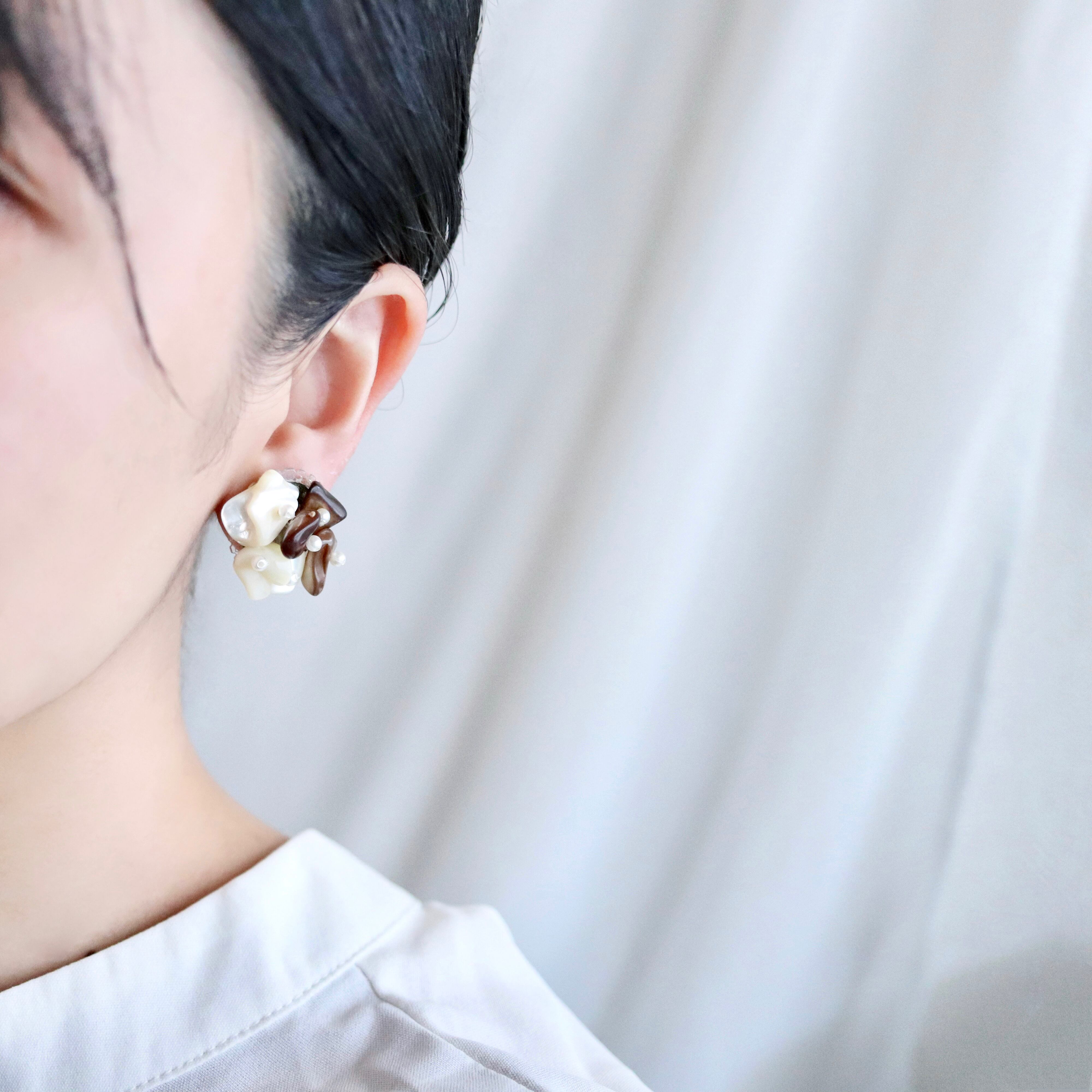 二種類のカーヴィングされたマザーオブパールを使ったクリップイヤリング。